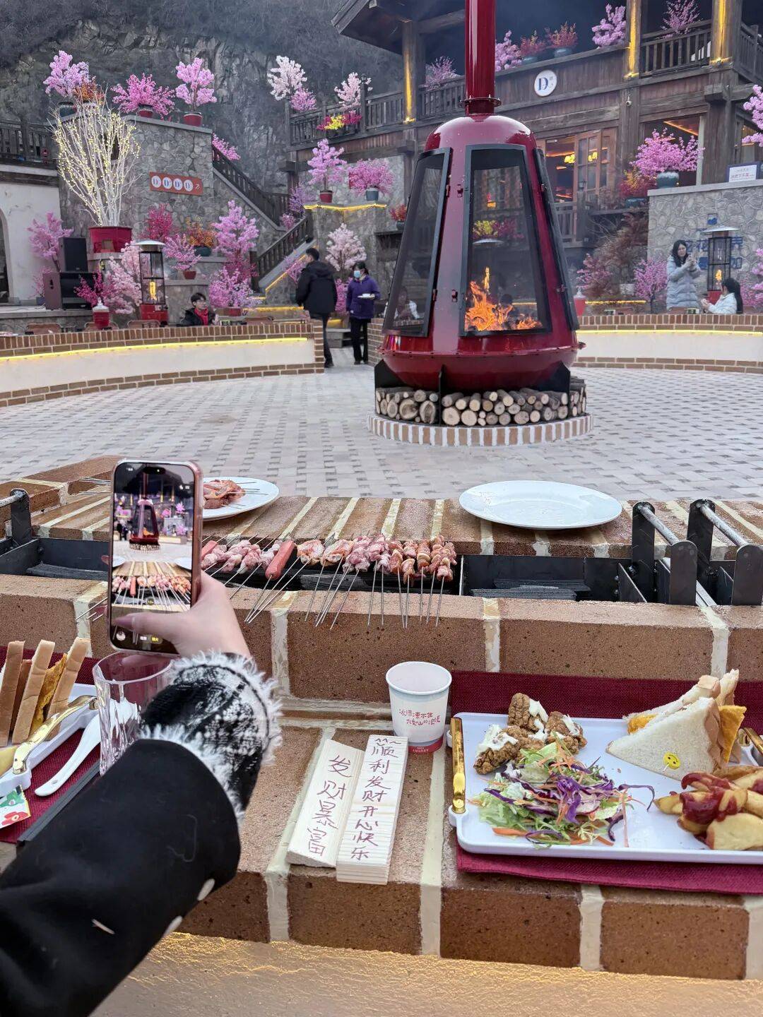 数百个火炉火力全开,几步一火炉,百米一木屋,让冬季之旅不再寒冷。烧烤、欢笑、火光,在九如山氤氲出从身暖到心的烟火气。