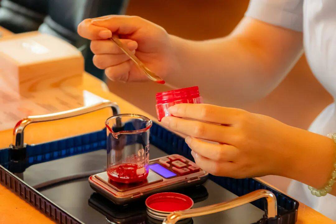 口红体验馆里,自主选择口红粉与树蜡、蜂蜡调和,打造专属的冬日唇色。
