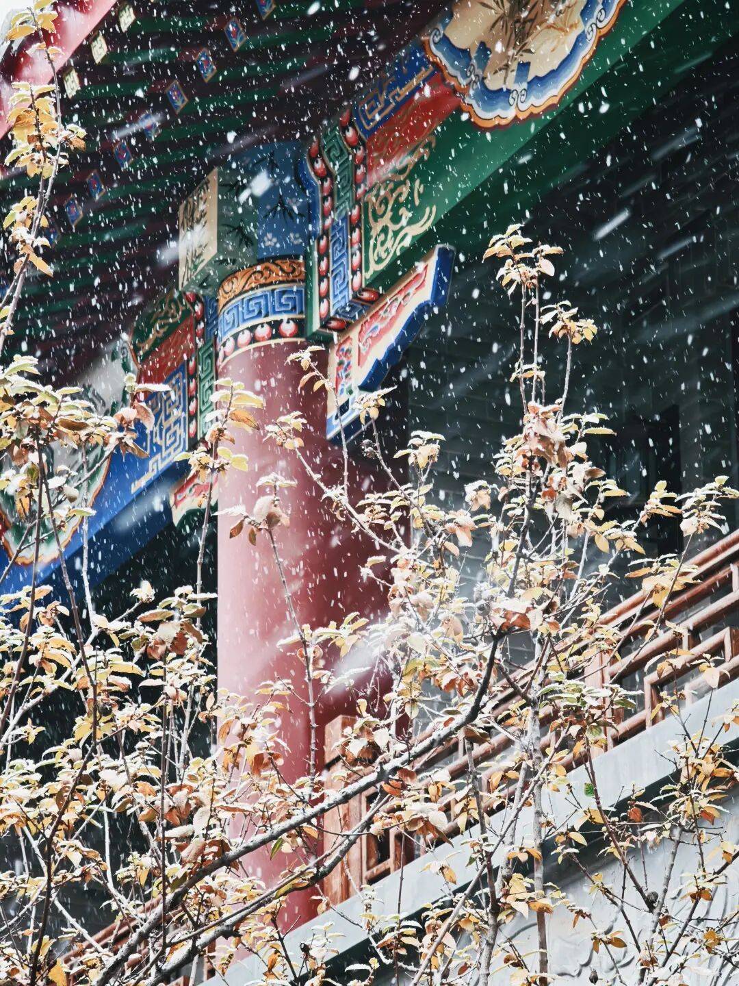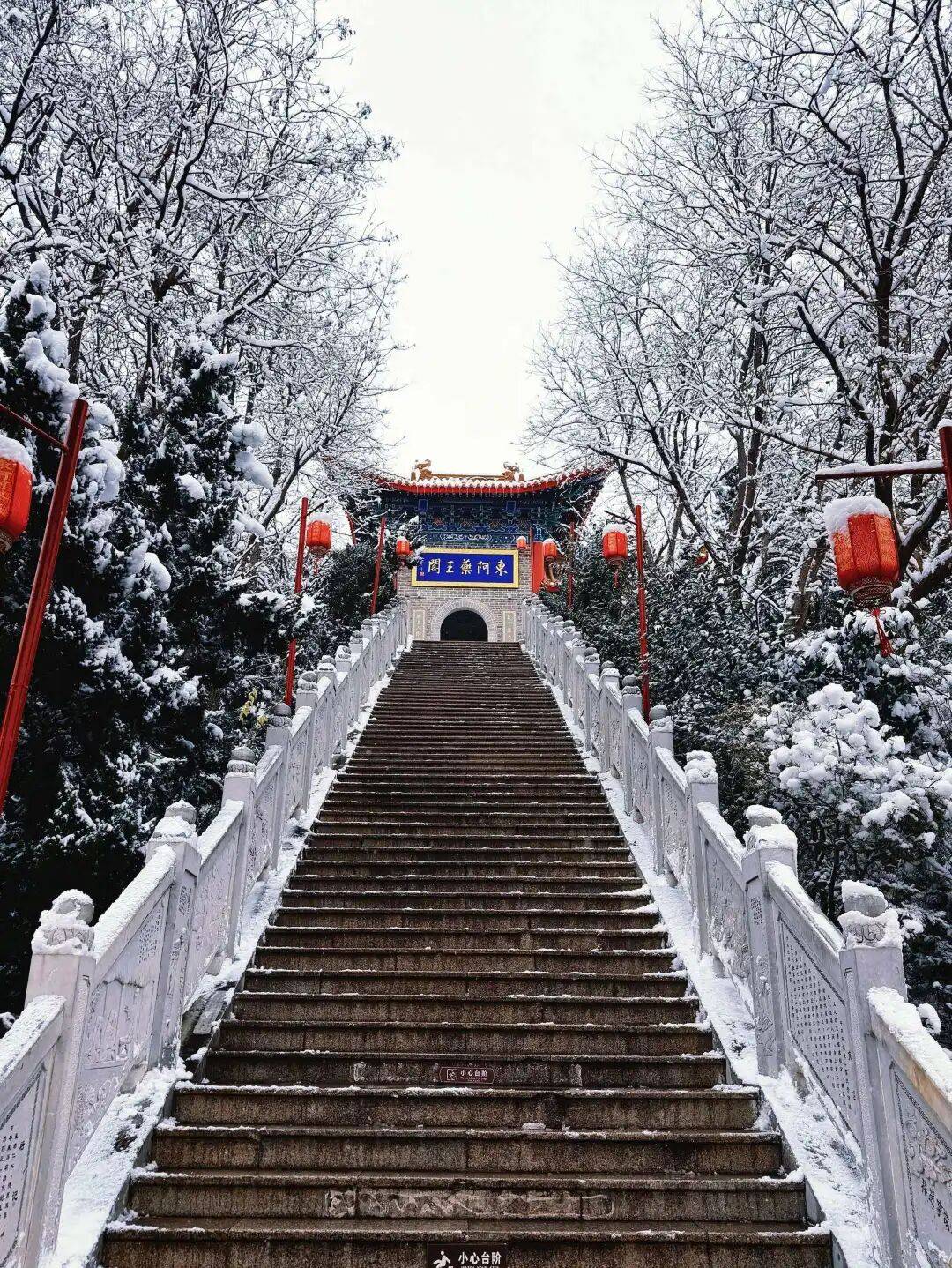 六百年飞檐挑着碎玉,七十二阶石梯裹上素绢。